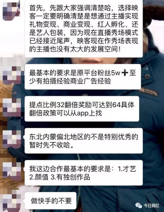 映客于2015年迅速崛起,“全民直播”影响巨大,人人都可以当主播,给映客带来了海量的新增人群。 “坚持全民直播,不与主播或公会签约!”强势的口号依旧荡气回肠。 然而就在映客卖给宣亚国际前夕,小红看到多个招募公会入驻映客平台的招募令,更有趣的是,信息发布者透露:这已经不是公会第一次入驻平台…… 最终映客选择了妥协,全民直播已成概念,公会作用真的不可替代? 近百家公会集结入驻 “映客要入驻的公会联系我,不是国际版是大陆版的映客!” 5月7日,自称负责映客公会招募的阿斌(化名)在朋友圈贴出这样一则消息。随后他贴出一个“映客入驻”群聊邀请二维码,各路公会负责人小象优品纷纷闻讯而来。 所谓公会,就是主播经纪公司。公会与平台,并不是新鲜组合,绝大部分平台都有公会入驻,形成主播、公会、平台的三级管理体制。 但对标榜“全民直播”的映客,至始至终号称“不签约任何主播、公会”,这是开了先河。因此小红第一反应是,难道谁打着旗号在江湖招摇撞骗? 小红首先找到映客相关负责人询问招募公会的事情。正如阿斌所说,映客不会对外宣传招募公会事宜。得到的答案自然是:不知情。 虽然映客官方没有证实,但阿斌的回答很肯定:“我不是映客官方的人,但没有我搭桥你们(公会)也入驻不了。”同时他也提到:“我只是作为中间人引荐有实力的公会给平台,你们的合作、签约都是和映客官方的。” 随后,阿斌就公会入驻的相关事宜大致讲解了一下: 大致意思有几点: 1.公会招募为私下进行,不通过官方渠道 2.公会入驻映客只能通过该中间人,再进入官方审核渠道 3.公会入驻之后与映客官方采取对公结算 4.公会入驻之后主播和散播主播待遇无二 5月10日,中间人阿斌一改当初“不需要任何入驻需求”的口吻,改而发布了一则入驻要求公告: 小红注意到,阿斌公告中提到“商业变现”、“红人孵化”、“艺人包装”等字眼。除此之外,“红人有拍摄商业广告经验”、“才艺好、颜值佳、有独创作品”的优先,似乎又不像是招募公会、限制主播,更像是在招募艺人。 有趣的是,在阿斌的要求中还有“快手的不要”、“东北的不要”,当问及原因时,他给出的回答是:那些人只适合在快手、YY发展,不适合映客。 小红瞬间秒懂,直播行业这深深的鄙视链条。 “全民直播”难再续 细读阿斌的招募公告,不难看出,公会入驻与否,影响的只是主播的结算方式。公告表明:入驻的公会可以控制主播礼物的提现,也就是采取对公结算。 某公会的刘sir对此表示:“公会比较偏向对公结算的平台,毕竟这种方式主播和公会的相互利益联系更为紧密。”刘sir进一步解释说,这不排除映客是在间接允许平台上团队运营的可能性。说白话就是,公会可以给主播刷榜了。 这么以来,其他看似与普通散播主播无差别待遇的条件就显得尤为重要了。 首先是映票翻倍,招募中间人阿斌给大家举了个例子说明:按照映客官方分成比例,主播(公会)提现比例为32%,但是官方每个月会给任务,完成任务过了翻倍到64 %。 “表面上,这与平台上其他散户的待遇无二,但公会在这里能做的文章可不是做任务这么简单。”刘sir表示,如果可以翻倍,64%比起很多平台的分成比例算高的了,如果每个月都能完成任务,那在映客运营主播可能是更好的选择。 的确如此,与对公结算的平台相比,陌陌剔除平台后主播占40%,一直播剔除平台后主播占30%,映客翻倍的64%确实能减少一定的主播运营成本。 与刘sir的乐观不同,另一位公会负责人Timi并不看好入驻映客的事。“公会在映客快手作品推广上的生存空间不大,一方面这个平台的主播变现能力普遍较差,用户粘性很弱;另一方面,公会分成实际上并不高。”Timi曾入驻过映客,但运营效果并不理想。 另一方面,从招募公告中对主播的要求来看,不由得让人猜测,公会入驻映客是否和平台造星有关。小红就此猜测咨询了业内人士。 其中,某秀场类直播平台的运营总监Xue向小红表示:“映客签约公会私下找代理(而不公开),为的就是一个‘全民直播’的牌子。造星更不可能。我个人认为,此次批量签约公会,应该是想要有规模引进优秀主播,提升整个平台的质量。” 他补充解释说:“大量引进的优质主播,也是为了缓冲现在映客几个头牌阵营的矛盾冲突,防止一家独大。” 他举了个例子,最近映客官方举办的“樱花女神大赛”,明显划分出冉大人阵营和二姐Alice阵营,从平台方来讲,双方出现竞争是好事,但这种制衡很容易被打破。 “甚至当映客流量都集中到某个阵营中去的时候,对平台的生态负面影响很大。”但在和公会合作之后,还会有下一个冉大人、二姐诞生。在Xue看来,这其实最基本平台运营策略,映客不会现在才明白。“只是现在被逼到悬崖边上,不得不做局部妥协。” 公会作用难替代? 公会行业自有其问题之处,但公会能在秀场里盛行不衰,映客的妥协,也让我们不由得再度审视其作用与功能。 此前,映客坚持不与主播签约,做素人直播。此前映客CEO奉佑生在一日客服的直播中表示:“做网络直播要克制欲望。” 映客2017年将继续以“用户为先”在他的规划里,映客号会像微博、微信公众号一样,成为每个人必备的交流工具,“人们在上面展示生活和才艺,表达自己思想和观点。” 但是,“用户为先”说起来很容易、做起来很难。首当其冲的就是庞大用户群的高