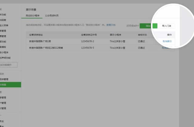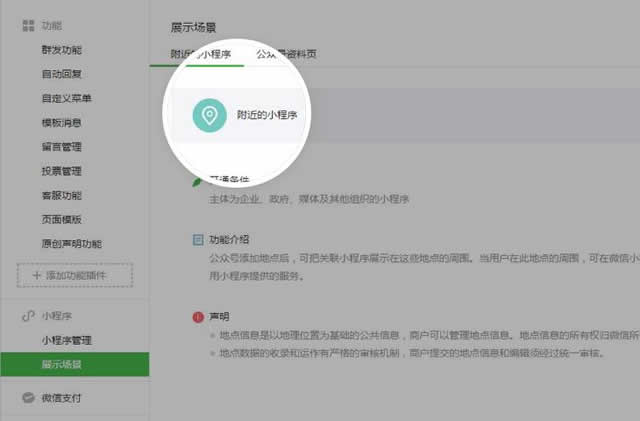 “ 公众平台新增附近的小程序功能,微信用户通过打开附近的小程序可获取更多小程序提供的服务。运营者只需要填写自己企业或门店的地点信息,即可快速设置特定地点展示自己的小程序。” 公众平台支持两种方式设置小程序展示在“雀巢公司危机公关附近的小程序”。 01 — 小程序使用公众号的地点展示在“附近” 公众号后台新增附近的小程序功能,申请开通后支持添加地点。 运营者添加地点后,每个地点均可选择展示一个对应的小程序。 已有门店小程序的公众号,以导入门店方式添加地点后,该门店小程序即可展示在附近的小程序。 另外,门店小程序已支持快速在门店页上配置发放卡券。