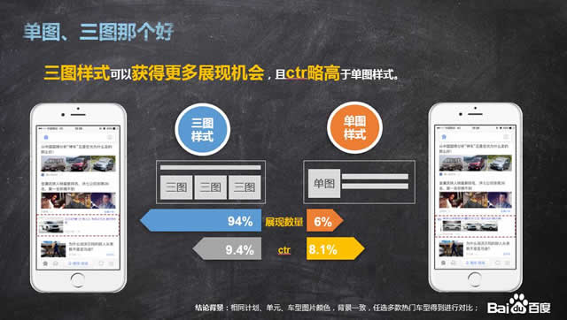 我们选取相同计划、单元、车型图片颜色,背景一致,任选多款热门车型得到进行对比,发现,三图样式可以获取更多展现机会,且ctr略高。