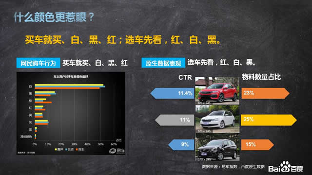 易车指数公布数据,白色,黑色,红色最受追捧,而根据原生客户投放数据发现,CTR最高车型颜色分别是,红色、白色、黑色,而图片数量最多的是红色。