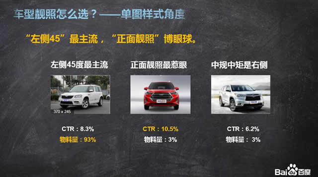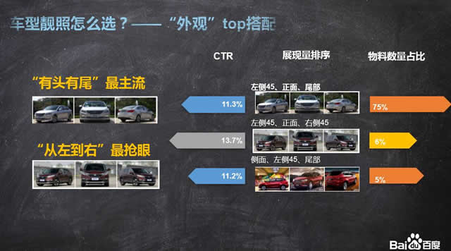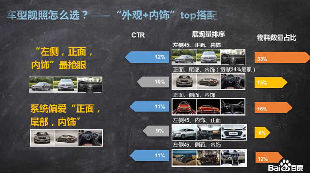 说完了外观内饰组合之后,我们在看看纯外观搭配的三图样式,应该如何搭配,行业客户的物料表现如下,有头有尾的左侧45度、正面、尾部组合最主流,75%纯外观三图物料选用此类搭配,且词搭配ctr高于行业均值。