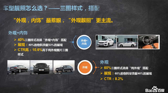 外观+内饰最惹眼:CTR高于纯外观三图样式物料。 外观靓照更主流:汽车资讯行业客户三图样式60%的选用纯外观图片搭配。
