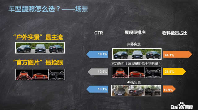 了解完颜色,角度,搭配之后,我们再了解一下不同场景的车型图片在百度信息流中的表现。 从物料数量来看,户外实景照片成为主流,而车型官方图片CTR略高于其他场景图片。