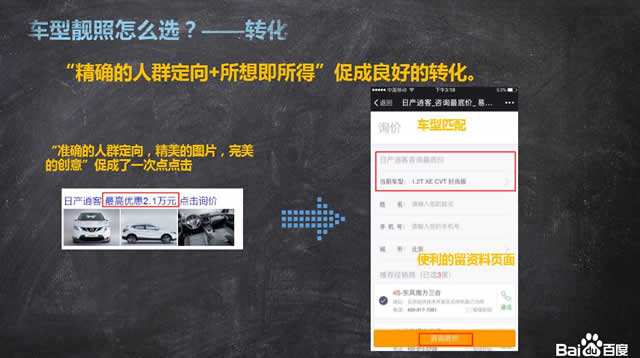 8)转化 最后说下,当我们通过精准的人群定向,精美的图片,触达内心的创意,获取了在目标人群的一次点击之后,所想即所得的落地页面+方便快捷的留资页面才能化作最终的效果转化。