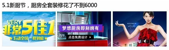 厨房装修→五一特价→全套省钱了。这套节日促销物料点击率一般,不过客户反映转化率很好。