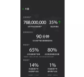 【微信用户快速增长】 微信已不单单只是一个聊天工具,更多地它变成我们接收资讯、便利生活 的日常使用工具。日登录用户高达7.68亿,比去年增长35%。而每个用 户平均每天使用90分钟,其中80、90后占65%,95后占14%,老年用户占1%。