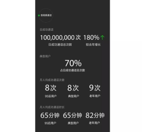 【微信语音代替收费电话】 目前微信语音通话日使用量为1亿次,较去年增长180%,其中典型用户占70%,其次日使用最高为老年用户,平均每人每月9次成功通话。