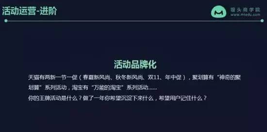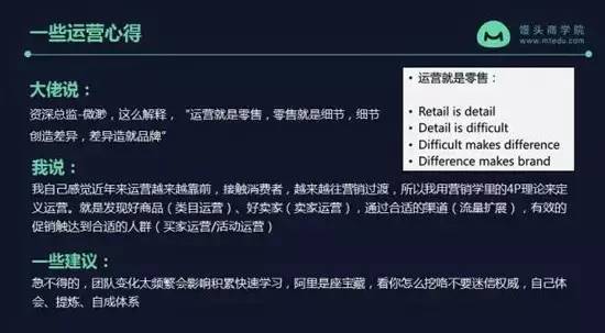 我在阿里的时候经常参加一些培训,我觉得印象蛮深的是一位资深总监叫微渺,TA说“运营就是零售,零售就是细节,细节创造差异,差异造就品牌”。其实有的时候,我们会觉得运营很大,很难去解析它或去着手,其实想一下,它跟线下的零售是相通的。比如大家走进商场看一看,很多规律都是一致的,只是一些细节不一样。所以,运营的好坏考验的就是细节的功夫。