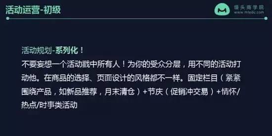 一个初级的活动运营至少要做到活动规划要有系列化。不要妄想一个活动戳中所有人。为你的受众分层,用不同的活动打动他。因为有了不同的分层,所以在商品的选择、页面设计的风格都不一样,这样就不会让你每一张活动页面看起来都没有个性,都像一个大杂烩一样。一个有系列的活动规划,大概会有这固定栏目、会有节庆促销,会有情怀/热点/时事类活动这三个部分组成。