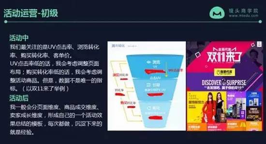 大家可以结合右边的两张图来看。右边第一张图是一个流量的一个漏斗转化,上面有一些关键的指标标注在上面。另一张图是我们去年的双11来了,也是我做的一张页面的一个截图。活动中,我们最关注的是点击率、浏览转化率、购买转化率和客单价。 活动期间,我会密切去关注这个数据,如果发现点击率低,也就是说到了双11来了这张页面来了很多人可是点击的很少,我就会考虑调整页面布局,或者调整Banner上每一个区块的文案或者图片,让他更加吸引人有点击的欲望。如果我发现这张页面购买转化率低的话,我会去调整活动商品,可是这个商品不够吸引人。但是数据也不是的指标。 比如说,双11来了这张页面就比较特殊,是双11一系列页面打头阵的一个,它是起到一个调动氛围,告诉大家好像全民都参与进来的,大家都开始躁动,包括明星达人和我们一起来加入了这个双11来了的造势的页面。所以说,这个页面我们对它的购买转化率并不是那么看重,而是看重它的点击率。希望大家更多的是逛起来,不一定买,但是在积蓄一个热度,让大家觉得,双11的氛围快来了,更加期待后面主菜的上来。