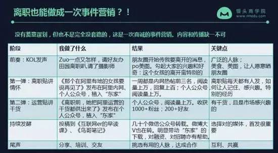 前奏 第一个阶段前奏,我先做了一个 KOL(关键意见领袖,就是传说中的网红大V)发声。找了一些好朋友在我们公司阿里巴巴的一个田园,我是真的在阿里有地的,在阿里开垦了一个田园,在阿里的阳台我们的菜地,办了田园的离职趴,请了摄影师。这件事情,很多人就在朋友圈开始传,芮曦要离开的这个消息,他们把美图发出来,勾起了大家的兴趣和好奇:这个女孩的离开蛮特别的。这里面的关键点就是说,你可能要有一个广泛的人脉,要找到KOL,而且你要有美食美图,让人愿意分享到朋友圈。 接下来的第一弹就是我写了一篇离职贴讲情怀的——那个在阿里有地的女孩要说再见了,发布在阿里的内网、个人公众号,里面植入了“东家”。带来的结果就是,那篇文章一周都是内网热帖的前三名,阅读量上万,回复上百;个人公众号阅读量上万。这个是在阿里的离职贴比较少见的。离职贴每天都有,为什么这篇比较特别?因为它有让人记住的点,感兴趣的点,而且我有一些特别的经历在里面。大家会觉得说,在阿里这么辛苦的地方,也能过得这么有情怀,好像很不容易。而且她离开了去的那个地方,大家觉得既然那么契合她,那个地方也有过人之处,所以大家对东家也比较关注,东家的下载量也上去了。 发展 第二弹,就是我发布了一个讲干货的运营帖,发布在我个人公众账号上的,里面也是植入了东家。它产生的一个结果就是,我自己的一个微信号获得了1000+的粉丝,200+的好友加我私人号,但是好多人我还没有通过。关键点就是有干货,而且市场是对这个干货是感兴趣的。 高潮 到下一个阶段就是持续发酵的阶段,我其实只做了一件事情。我把它投稿到互联网er的早读课、,没花一分钱,当然我也没收钱。就是你找到了一个对的地方去投放了你的好的内容,砰的一声就爆发了。几十个微信账号去转载,微博大V也在转,明显带动了东家的下载,为公司融资、招聘都是有帮助的。那这里的关键点就是选择对的媒体,首发很重要。也是由于这篇文章,也交到了很多朋友,后续我可能会用这些带来的人脉达成一些合作,达成互利和共赢。 好,这件事情我的新的老板就很开心嘛,他说,那就再来一次咯。我就想说,很多做市场、做新媒体的同学可能都会面对老板的要求,要做事件营销,面对可遇不可求的事件营销,我的应对的方法就是,我要做的话我会是基于内容,基于自身调性来做的,我不会说任何热点我都会去蹭。第二点是说,我会把每一个case都当成一个有希望引爆的种子。从标题、内容上去打磨,洒下1000颗种子,万一有一颗引燃了呢!