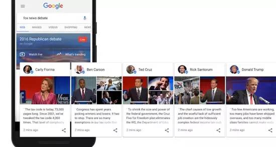 1、Google助力美国大选,实时呈现候选人动态 美国四年一次的大选又开始了,这次Google为总统大选特别增加了搜索结果动态展示获选人信息,候选人的Google搜索趋势排名,以及由Youtube热门播客主持的网友提问这三大功能,以此来助力美国大选。不知道这次奥巴马能不能连任。