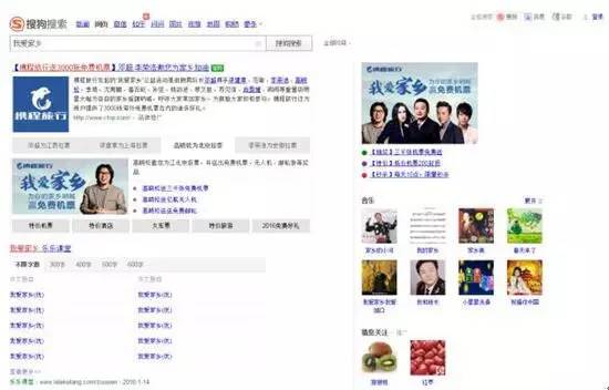 2、搜狗玩转明星营销 助力携程“我爱家乡”公益行动 对于追星族来说,最常做的就是搜索明星最新资讯,全方位了解明星、以及找到追星同伴。搜狗搜索洞察到用户这一痛点,将所有的明星相关资讯进行高度整合,推出“明星一体化搜索”功能,让追星族们仅需输入偶像名字,就可以一键获取获得自己所想要了解的全部内容。 在猴年春节到来之际,搜狗助力携程 “我爱家乡”公益行动,打造了一场不同凡响的明星公益活动推广。通过输入法一键直达、搜狗百科、搜狗地标等商业产品,搜狗将携程“我爱家乡”活动中邓超等15位名人“我爱家乡”的理念全面传达,呼吁人们对家乡更多关注,发现家乡之美,鼓励家乡旅游,支持家乡建设。