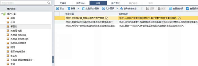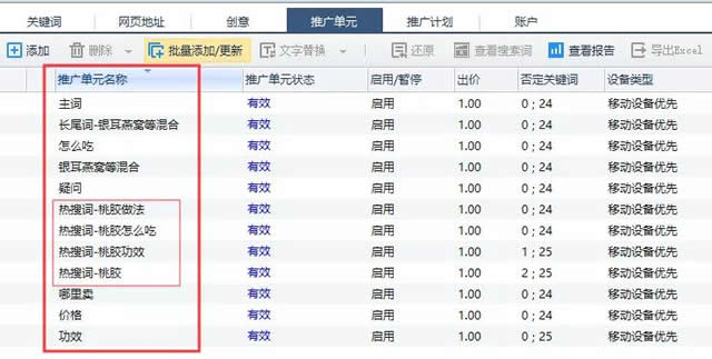 推广单元名称 我大致将推广单元分类成12个不同属性的推广单元;意向强的是价格、哪里卖这两个单元,那么这两类单元组的关键词出价可以适当提高些,其中四个热搜词单元单独列出来,里面我只对应一两个关键词,因为这四个单元后期会占据账户大部分消费。 分类依据:在任何一个行业,首先这个行业产品的名称舆情预警报告词,例如“桃胶”这个词检索量是最大的,其次在搜索引擎下拉框的几个检索词流量也紧跟其后,可以将这几个检索量较大的关键词单独分配单元,在后期观察数据走向可更直观展示出来;以及对撰写优化创意更有针对性。 另外大家要注意一点,单元内的关键词最好长短差不多,否则创意撰写时,通配符关键词长度太长,无法放产品信息;或者你放短词进通配符,则长词匹配到时,会导致创意截断。 关键词解读