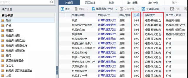 出价 前期关键词出价在什么阶段合适,关键词最低出价是不低于0.3元,如果你在搜索引擎上搜竞价同行有5家以内,你可以出价1元以内,5家同行以上一般出价1元以上,也可以自己衡量一个出价,因为各行业不同,账户上线后关键词所产生的数据指标展现、点击、点击率再次调整。 注意上线后一定要重点关注高展现、高点击、高消费的词数据走向。 匹配模式 精确----------(匹配的搜索词完全一致) 短语-精确包含-----(匹配的搜索词极度相关) 短语-同义包含-----(匹配的搜索词高度相关) 短语-核心包含-----(匹配的搜索词相近相关) 广泛-------------(匹配的搜索词一切相关) 当你深刻理解匹配模式的含义与触发原理,那么在后期关键词所产生的数据指标;展现量xx、点击量xx、点击率多少,点击均价多少,你就会知道怎么去控制调整每个关键词的流量大小。 关于展现量/点击量等这些数据指标如何去深入理解;可参考笔者之前写的这篇文章:关键词数据指标分析的核心秘密 匹配模式前期选择适中的最好,短语-同义包含,如果是热搜词,这类词本身搜索流量就大,不想让它匹配到乱七八糟的词,那么可以设置为短语-精确包含,其次关键词字数较长的,俗称“长尾词”,可以设置为-短语-核心包含。 创意解读