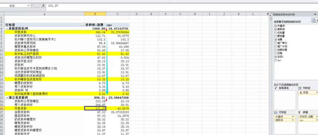 (图3) 1、从搜索词到关键词(见图4) • 数据处理:利用Excel透视表,先对搜索词消费栏降序排列,再对关键词消费做降序排列,增加“计算字段”得到cpc,这样主消费的搜索词和关键词清晰明了,较高cpc的搜索词需要优先处理。 • 分析目的:主要看一个周期内,搜索词消费是否异常,比如:标黄的“中医皮肤”,这样不带任何意向的通用关键词,短时间内被消耗了1344元,且cpc达到了21块,非常夸张。 • 处理方式:匹配方式对关键词实际转化效果的干扰,主要表现在搜索词上。因此,对问题搜淘宝直播怎么收费索词所在计划,尤其是高价计划,需要精确否定或修改匹配方式。