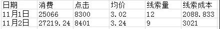 (图8) 6、cpc对转化成本的影响(见图9) 11月2日,总点击8401,cpc3.24元,比前天仅仅高0.22元。 因为点击基数大,8401*0.22=1848,增加的1848元实际上就是0.22元直接导致的。 线索成本也因为增加的2毛钱,直接上升200元。 所以,账户点击量上千或上万时,对关键词均价的把控需要极其敏感。