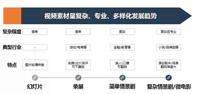 看产出,复杂、专业、多样化的素材形式是大势。复杂、专业的视频素材,不再是OGC、PGC的专利,许多UGC也能带来足够惊艳的视频内容。不同行业对视频素材的专业性要求也不一样,从相对简单的图片轮播、录屏形式,到需要专业设备取材的抖音运营标签情景剧,到为产品专门创作剧本的微电影形式,因行业而异、因投放平台而异、因投放时间而异。