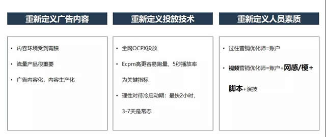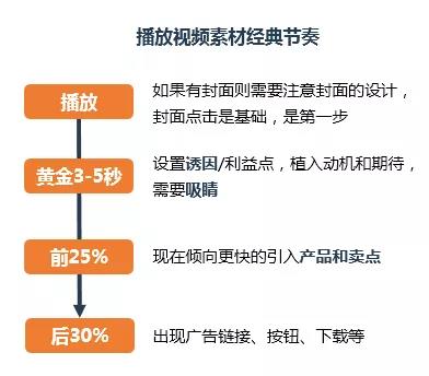 当然,考虑到视频素材的来之不易,素材下线之后,可以通过换位置、换文案两种方式重复利用。换位置,可以把已经衰减的视频素材,下线后在其它计划、组重新上线,这个过程可以对原素材进行重新编辑,也可以直接换位置。换文案,对于已经衰减的视频素材可以进行文案、封面等微调后,作为新素材重新上线。 Tips:把握黄金3-5秒。在播放视频素材的过程中,也需要掌握好节奏,不可错过的是视频播放的黄金3-5秒,露出诱因或动机,吸引关注,后续再逐步引入产品和卖点,加入广告链接、按钮、下载等,形成点击、诱因、卖点、转化的层层递进。
