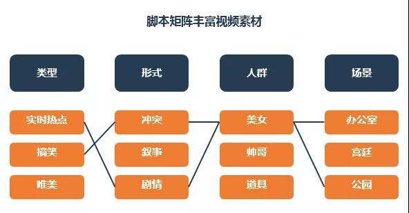 方法二. 脚本排列组合法。视频矩阵的搭建需要大量的脚本素材,采用此脚本素材组合法,将不同维度的脚本进行连线组合,将脚本最大化利用产生出更多视频,从而丰富素材类型,满足视频矩阵策略大量的素材需求。