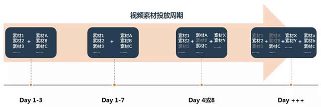 素材周期,新旧交替。素材上线1-2天开始起量,给冷启动期耐心,起量后时刻观察波动,准备上新素材,一周后逐步衰减,补进新素材。