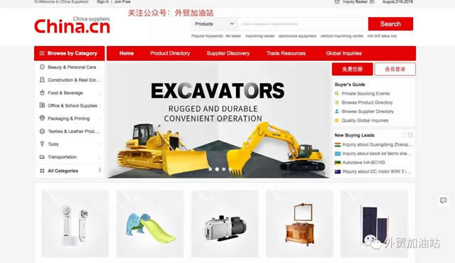 三、中国供应商 官网:https://cn.china.cn/ 中国供应商是为了推动中国制造业及对外贸易产业重拳打造的B2B电子商务平台。中国供应商项目应用创新网络技术,为用户提供信息存储、搜索、链接等网络技术服务,将用户自行发布的信息公平公正的展示在平台上,为企业之间诚信贸易打造良好的互联网交易环境。 中国供应商网站推出后,即获得人民网、新华网、央视网、国际在线、中国日报网、中国经济网、中青网、中国广播网、千龙网、东方网、南方网、北方网、红网、东北新闻网、东南网等大型媒体及官方网站的大力协助;新浪、搜狐、网易、腾讯、中华网、Tom、凤凰网等知名门户网站及Google、百度、MSN、奇虎网等各大搜索引擎的一致支持。