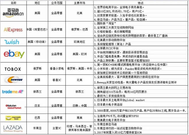 跨境电商最火的平台当属Amazon,很多地区可以首选Amazon,其它当做出货的小渠道来经营,不要太多,但是都可以适当的了解,小渠道的竞争更小。 如果你的产品适合北美地区,那么你可以选择: 1. Amazon肯定作为首选,相对较公平,发展前景好,最关注的是产品 2. Ebay 作为老牌的欧美电商平台,跟淘宝有的一比,实际是全球最老牌的 3. Wish 这几年火了很久的一波,近年来因为卖家总是被罚没资金,做的有点心惊胆颤 4.Newegg 主要做3c产品的,之前做了很大一波,靠谱 如果你想卖英国: 1. Amazon英国站是很火爆的一个平台 2. Ebay英国站同样是很早就进入英国市场的 3. Tesco 大型零售商,线下积累很多年了,客户在往线上转移,流量大 如果你的产品适合德国市场: 1 .Amazon在欧洲都是首选,比较严格,但是利润高 2 .Ebay 德国站也很早布局了,依旧好做 3 .Zalando 做服装德国的好好考虑下 4 Otto 奥托集团 德国电子商务零售商 法国市场也不容忽视: 1. Amazon法国,欧洲站的一个点 2. Ebay依旧也很久了 3 .Priceminister 目前被日本乐天收购,法国老牌电商了 4 .Cdiscount 批发,低价的产品 有点类似1688 新西兰 1.Amazon新西兰,欧洲站 2. Trade me 类似ebay,新西兰本土电商企业 日本市场 1. Amazon日本站 还真的不是非常火,但是好做 2. Ebay很早也入驻了,ebay真是无处不在 3. Rakuten 日韩联合了,乐天 韩国市场 1. Amazon 2. Gmarket 2000多万人注册了,韩国电商平台 3. Ebay 4. 速卖通 印度现在可是世界工厂 1. Amazon Ebay 速卖通 2. Snapdeal 印度小渠道 3. Flipkart 印度本土的淘宝 中东市场也很富裕,购买力强 1. Souq 移动端领头羊 2. Amazon ebay 俄罗斯 1. Amazon Ebay 速卖通 2. Ulmart 俄罗斯京东 3. Ozon 也是一个电子零售商,服务型产品更多 非洲有没有兴趣 1 .Amazon Ebay 速卖通 2. Jumia 覆盖人口5亿,有便宜好用的东西,可以考虑过去,尼日利亚最大市场 3. Kilimall 刚发展起来的 东南亚这一带 1. Amazon Ebay 速卖通 2 .Lazada 目前被阿里收购,开始布局东南亚市场 3. Zalora 女性产品居多,总部在新加坡 4 .Qoo100 新加坡发展的比较好 每个平台都有不错的流量,专心做好产品,很多渠道可以卖!