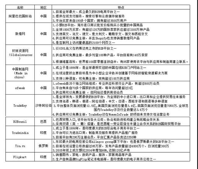 附:全球外贸B2B平台大全列表 1stworldtradeportal、21food、africabusinessnet、algomtl、Alibaba、Aliexpress、all-biz、asean1688、asia-manufacturer、Asiannet、asianproducts、asiatrade、asiatradehub、australiatradenow、B2B 1st、b2bchinasources、b2bfreezone、b2bpakistan、b2bquote、b2brazil、b2s、bazar-az、belgiumtradenow、berlinkauf、bestsme、bikudo、biztrademarket、bizviet、bloombiz、bombayharbor、bossgoo、bridgat、businessseek、busytrade、buyerzone、buykorea、bysources、chemicalbook、chemnet、chinabusinessworld、chinaexporter、chinatexnet、chinavalvepump、coovee、Dhgate、Directindustry、Diytrade、竞价推广策划easy2source、ebay、EC Plaza、EC21、ec51、eceurope、Ecplaza、ecrobot、ectrade、ecvv、egtrade、eindiabusiness、emarketservices、embiz、esources、etradeasia、europages、e-worldtrade、exportapymes、exportbureau、exporters、exportersindia、exportfocus、exportid、exportpages、fedvendor、fibre2fashion、FITA、Forbuyers、foreign-trade、fuzing、Gasgoo、germanybusinesshub、Global Sources、globalbuyersonline、globalmarket、Globalsources、Globalspec、global-trade-center、globaltradevillage、go4worldbusiness、gobizkorea、golden-trade、gongchang、guidechem、himfr、hisupplier、hkinventory、hktdc、imexbb、imould、importbureau、indiamart、indiatradezone、infodriveindia、ioffer、ipfonline、jimtrade、Kompass、koopkeus、lameibiz、lightstrade、liquidation、list-company、lookchem、madeinchina、made-in-china、mercatrade、mesteel、MFG、mfgtrade、mfrbee、nowec、preisroboter、prom.ua、rusbiz、rusmarket、safestchina、seekic、seekpart、sonhoo、southafricab2b、sptechs、stonecontact、sugoo、taiwantrade、tdctrade、thomasnet、toboc、toocle、tradeasia、Tradebearings、tradebig、tradeboss、tradeeasy、tradeindia、trade-india、tradekey、tradekr、trademetro、trade-ok、TradePort、trade-romania、traderscity、tradett、tradevv、ttnet、tulaoge、twfta、wholesalecentral、wholesalehub、woodbusinessportal、worldbid、wotol、yeskey、阿里巴巴国际站、东盟采购网、敦煌网、YALAB2B中东贸易平台、海商网、环球市场集团、环球资源网、拉美贸易网、马可波罗、贸发网、欧洲黄页、世界工厂、速购网、万国商业网、文笔天天网、亚洲产品网、伊西威威、中国出口网、中国制造网。