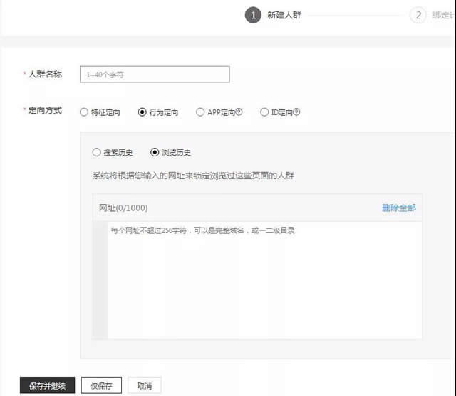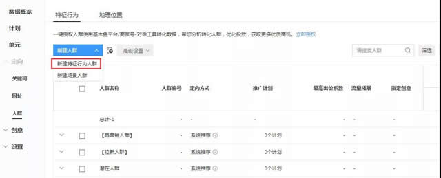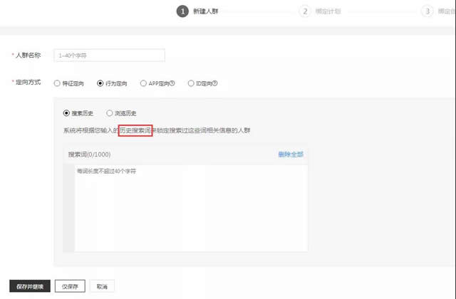 ▶步骤二:【新建人群】进入下拉菜单----【新建特征行为人群】 1)搜索历史,根据搜索词来锁定二次营销的人群。 注意:因词包数量有限,可分为多个词包。 词包选择可以先从品牌词开始,然后是产生订单、线索、对话、表单的搜索词,最后是账户后台产生的搜索词。 【人群名称】可以根据搜索词类型来命名,方便跟踪数据和效果优化。