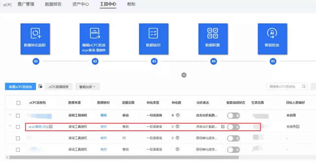 此人群计划建完以后,就关联了账户指定计划。 如果人群计划还需要关联ecpc,获取更多大数据智能投放,进入【ocpc】管理页面继续绑定。 ▶步骤四:进入【ocpc】