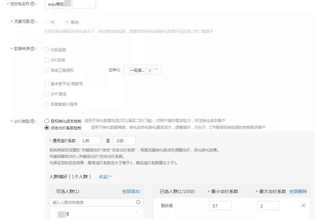 点选【ocpc投放包】,展开【人群偏好】,添加做好的人群包,设置【最小出价系数】和【最大出价系数】 百度解释:为保证您的投放效果,最高溢价系数应大于等于2,最低溢价系数建议小于1。