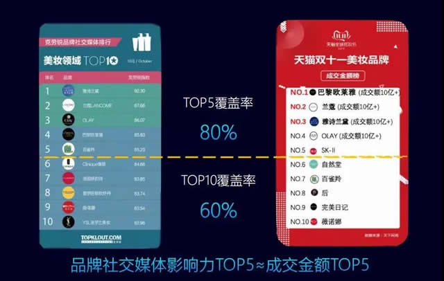 惊人的带货量背后,是“绝对低价”筑成的护城河。无论品牌大小,“极致性价比”是红人带货(尤其是直播带货)的重要原则,所以可以看到,出现在双十一直播间的货品大多是特品或打折商品。而低价博销量是长远之道吗?根据TOP君观察,爆发于的品牌往往更高几率遭遇增长天花板。 其次,红人选品看重是否与自身形象符合,也看重是否符合粉丝偏好,所以他们在选品的时候比较挑剔。价格、品牌、粉丝等众多权衡的因素中,品牌力和由此衍生出来的社交口碑,成为决策的主导因素。 对比克劳锐“品牌社交媒体排行”与“天猫双十一美妆品牌成交金额排行榜”,Top5中有4个品牌是一致的。