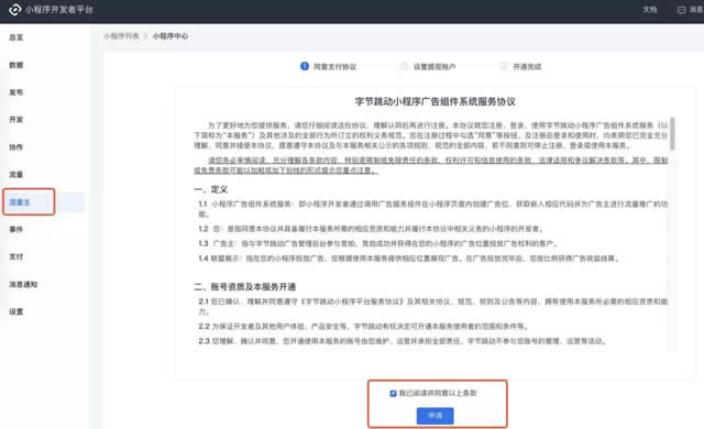 2、怎么开通? 头条小程序流量主功能已全量开放。 1)登录小程序开发者平台,点击“流量主”模块
