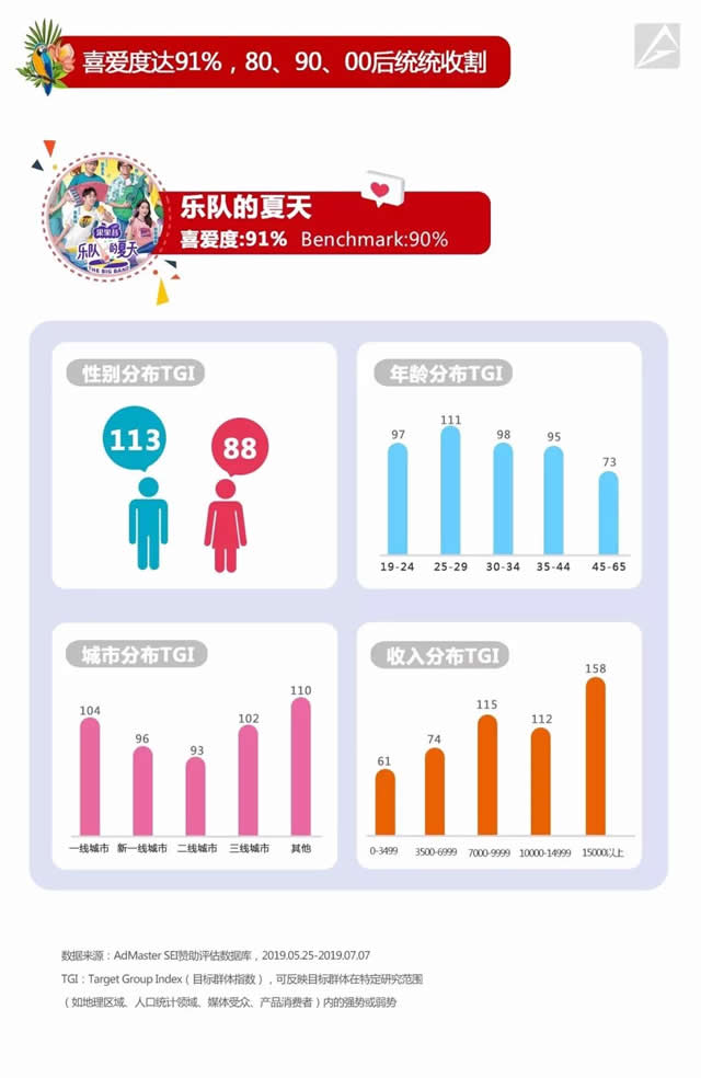 人民网是这样评论《乐队的夏天》的:“不止传递乐队文化,同时也引领了青年文化,节目以独立乐队的方式,引起新时代青年人的共鸣。”这档试图冲进大众的小众音乐综艺,正通过充分挖掘乐队,引发全年龄层热议,养成最具参与感和时代记忆的综艺节目。 正因如此,《乐队的夏天》吸引了大量“高净值”的用户。他们囊括不同年龄阶层,覆盖各线城市,收入15000以上人群为主,56%是具有消费决策力的男性。 无论是00后的个性表达,还是90后的情绪发酵, 亦或是80后的热血不老,都能在节目当中找到情感的归宿,高净值的用户们以极高的节目参与度,让活化品牌价值有了最有效的途径: AdMaster SEI赞助评估数据报告显示,节目的独家冠名赞助商优酸乳果果昔,凭借高强度贴片广告、节目中的多场景植入、人气乐队的创意中插,其多项赞助指数均大幅高于行业均值,在不同年龄段的消费群体中留下深刻印象。