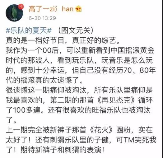 他们欢呼着,他们正年轻。他们在摇滚的热血中,学习接受:自己或许平凡,但世界永远广阔。90后的独而不孤,追求自由,崇尚善意,憧憬美好,都在乐队真实的激情中获得了淋漓尽致的表达。 和节目里多数乐手同龄的80后呢,他们更多看的是「情怀」。 作为第一个被冠以“xx后”名称的群体,80后曾经代表时代的希望,如今早已是社会的中流砥柱。 他们曾经见证中国摇滚的“黄金年代”,伴随着崔健、窦唯们的歌声成长。如今岁月已经老了,中年危机将近,澎湃的少年感早就伴随发际线悄悄褪去。 好在摇滚不曾老去,他们的心也不老。在物是人非的夏天,乐队综艺的爆火,重燃了他们彼时走在先锋文化前沿的热血。