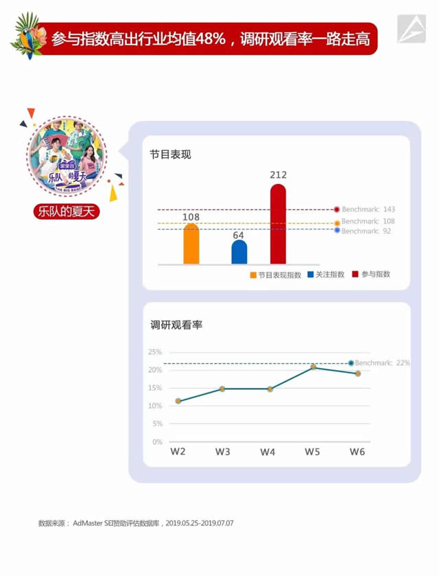 就好像“人世间悲喜烂剧/昼夜轮播不停”、“狡猾呀人们啊/在诚实的交谈中欺骗着自己和他”,刺猬的歌里有着中年人对现实的清醒认识;而他们仍然坚信:“一代人终将老去/但总有人正年轻”、“没有人会去涂改/梦境中的色彩”。肩扛重担逐渐步入中年的80后,依然有着对激烈地活着的渴望,以及在压力下生存的顽强。 网友@巨齿鲨的世界 表示:“每每看到石璐用娇小的身躯敲出密集又富含力量的鼓点时,我总会眼眶湿润。而子健如此倔强的将他写的歌喊出来时的冲劲,却又让人产生脆弱的伤感。 这些乐队在世俗压力之下对精神世界的坚持,这份难能可贵大概只有80后能够读懂。也正是因此,激昂的节奏、躁动的现场,才让中年人得以从残酷现实中抽身,汲取向前的动力。 据AdMaster SEI赞助评估系统数据显示,《乐队的夏天》播至第5期时,调研收视率已升至21%;代表全网社交声量的节目参与度指数,更高达212,超出行业均值48%,充分展示节目热度。
