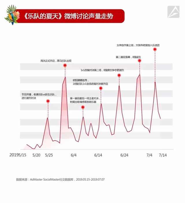 开赛即淘汰一半的残酷赛制、痛仰高虎连怼马东、刺猬爆发现场砸琴、女神合作加入鏖战……在这些热点话题的助力之下,《乐队的夏天》的社交声量也持续走高,每一期都造就话题峰值。