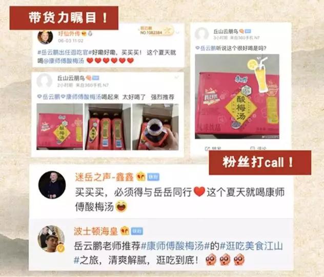 其次,小岳岳的带货能力瞩目,担任“首席逛吃官”后,引发微博下大量粉丝疯狂晒单。7月9日至10日的天猫大牌风云日,康师傅酸梅汤在两日内销量大涨,达成了可观的销售。