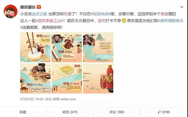 第二步:如何将传播爆点延伸至节目外? 以明星效应为支点,撬动岳云鹏背后更大传播空间 岳云鹏是明星效应的起点,也是核心点。 康师傅酸梅汤不仅仅是将岳云鹏作为代言人角色进行品牌营销,同时也在不断深化岳云鹏与品牌绑定后的人设运营。