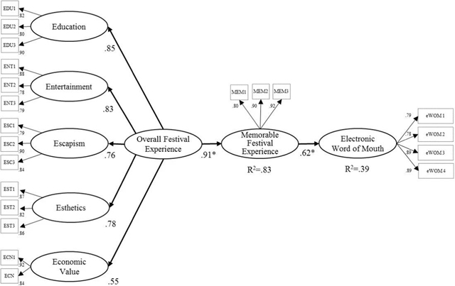 图片来源于:ScienceDirect 随着各类现场音乐节的急增,管理者意识到要让自己的活动与众不同,需要灵活运用营销手段,尤其是社交媒体,创造节日品牌资产。基于节日参与者年龄的差异性,本研究旨在分析代际群体(Y世代和Z世代)在社交媒体传播对节日品牌资产创造的影响及其相关因素中的调节作用。根据以往的研究,将Y世代定义为1993年以前出生的人;将Z世代定义为1994年以后出生的受访者。同时,为了检验社交媒体传播的影响,进一步细分为组织者创建的社交媒体传播和用户(参与者)创建的社交媒体传播。Llopis-Amorosa等学者在2014年西班牙阿里纳斯音乐节举办的不同的时间,一天的不同时段,在活动场地的不同区域对参与者进行了拦截式问卷调查。共收集问卷631份,其中有效问卷622份,问卷主要调查受访者对节日社交媒体传播的看法、品牌资产的核心变量、整体品牌资产以及节后的满意度和行为意向。文章采用结构方程模型进行了测量和多组分析,验证了所提出的假设。研究发现,代际群体在用户创建的社交媒体传播与现场音乐节整体品牌资产的一些前因关系之间发挥着调节作用。调查结果显示,首先,无论对于Y世代还是Z世代,用户(参与者)创建的社交媒体传播对品牌资产的前因变量的影响比活动组织者创建的社交媒体传播更大。其次,非活动组织者控制的社交媒体传播,对现场音乐节整体品牌资产的决定因素,即意识、社会形象、价值、服务质量、领先质量感知和忠诚度,具有积极影响。第三,参与者对节日整体品牌资产的感知对其满意度有显著的积极影响,也对参与者在节日后的行为意向产生了积极的影响。第四,Z世代和Y世代的用户创建社交媒体传播对参与者的服务质量和忠诚度的影响是存在差异的,相比之下,Z世代的影响更大。 原文链接:https://doi.org/10.1016/j.jhtm.2019.08.002 2、电子口碑与节日体验