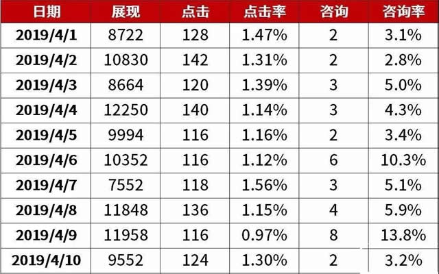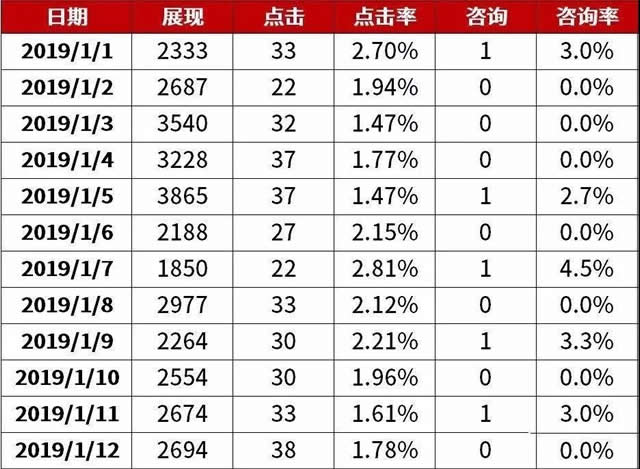 从后台数据报表,我们收集到了广告主自运营时候的数据,展现量和点击量都很少,一个月大约也就7-8个咨询。 经过关键词拓展以及创意优化后,展现量与点击量大幅度提高,每天咨询也有2-4个,甚至有时候能有6-8个咨询。 优化后数据: