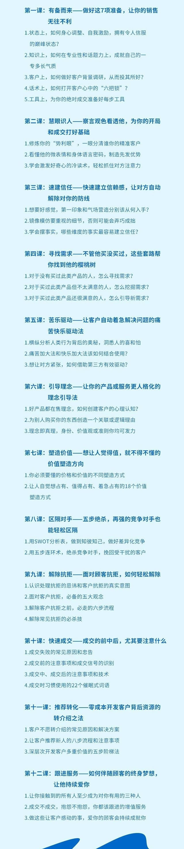 销售,是普通人通往成功的最短路径。 如果你问,这个时代,做什么收入最高?答案依然是销售。 遍观近代商业史上,有许多成功的老板、企业家,都是做销售出身:格力董事长董明珠、香港首富李嘉诚,以及阿里中供铁军出身的程维、干嘉伟、吕广渝、陈国环等。 但是,想把销售做好却没那么简单。当顶尖销售轻松签单年入百万时,绝大多数销售人员还在拿着3000元底薪努力赶业绩。一个非常重要的原因就在于,顶尖销售都是在引导客户自己说服自己,而普通销售则是在一味地说服对方。 在销售过程中,很多销售人员都会进入一个误区,就是认为自己的销售方法可以搞定客户,因此他们都会通过各种手段去说服客户购买,不断地推销甚至是逼单,把销售当作了和客户博弈的过程,给对方造成一种“强迫购买”的感觉。 没有客户喜欢被人说服危机公关四阶段模型案例分和管理,尤其是当销售员在沟通时没有获得对方信任的情况下,继续紧逼将会对后面的成交带来更大的困难。 所有的销售成交,从根本淄博 网站开发上来说都是客户自己说服了自己。销售人员要做的,就是了解客户的真实需求和购买心理,帮助对方找到一个不能拒绝的购买理由,引导客户说服自己,从而完成成交。 然而在销售过程中,销售人员面临着各种各样的难题: ·不知如何开场,总是老一套的说法 ·面对难缠的客户,怎么也找不到切入口 ·客户明显有意向,但就是不成交 ·不明白客户的需求,一味地推销产品 ·在沟通过程中,客户总是提出各种各样的要求 做销售,关键是要有“搞定人”的能力,能够运用策略和计划的能力,一步步地解除客户的抗拒,获取信任引导达成成交。 ![]()