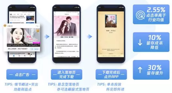 在七猫的案例中,因为有留存oCPA的加持,整个留存优化的策略变得十分清晰简单: 第一步:精选素材内容和优质广告位; 第二步:结合系统分析得出的人群洞察报告,七猫精准设置此次投放的人群兴趣定向,高效找到目标人群; 第三步:使用留存oCPA出价,在控制成本的同时提高留存率,并使用自动扩量,高质获客。 策略四:应用直达,全链路优化满足用户预期 广告投放中,还有一个重要因素影响着留存率数据,那就是最终用户打开APP的内容是否能承接广告素材的内容。若用户被广告中书籍A的情节吸引,但下载并激活APP后看到的却是书籍B,这样的内容无法承载用户的预期,留存率也就越低。 针对这一痛点,腾讯广告采取应用直达的方式,简化用户触达产品内容所需的环节,用户下载完APP后将直接跳转至广告中推广书籍的阅读页面,所见即所读,大大满足用户预期,提升用户体验。下图的数据,将让我们对应用直达方式的转化率提升效果,有个更直观的认识。