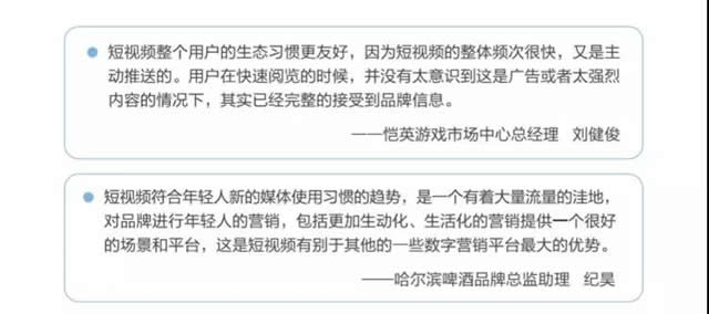 短视频营销分析 短视频成为营销新战场。内容从图文到长视频到短视频,从横屏到竖屏,传播形态也因为短视频的出现而发生演变,短视频成为了品牌新的社交语言。 经过近两年的电商运营和推广快速发展,短视频行业各环节已相对完善,在依托新技术实现全方位升级的背景下,短视频已经成为人们生活中的主流内容消费行为和习惯之一,这也让让短视频成为了品牌在营销中需要重点投入的领域。 基于短视频用户的内容消费习惯,广告主对于短视频营销的态度也发生了较大变化。 短视频原生、互动性强、多场景化、创意度高的优势,可以帮助广告主在品牌建设、内容营销等的过程中可以全人群覆盖、立体式表达、多元化展现,更加精准有效地触达目标用户。