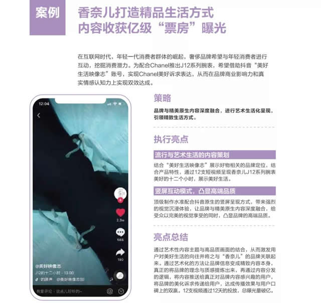 1.挖掘垂直化短视频潜能,聚焦细分人群和场景,助力品牌精准传播。 对于品牌而言,垂直内容能够精准直击目标受众,帮助品牌在最短的时间找到目标受众,完成品牌与受众的无缝对接,激发新的销量增长点。 2.搭乘精品化内容,深度传递品牌信任。 精品内容能提升用户对产品偏好度、品牌体验度、品牌价值认同、消费信心,最终将帮助消费者通过好内容感知到好的物品、产品和美好的生活方式,提升精神层面的愉悦感。
