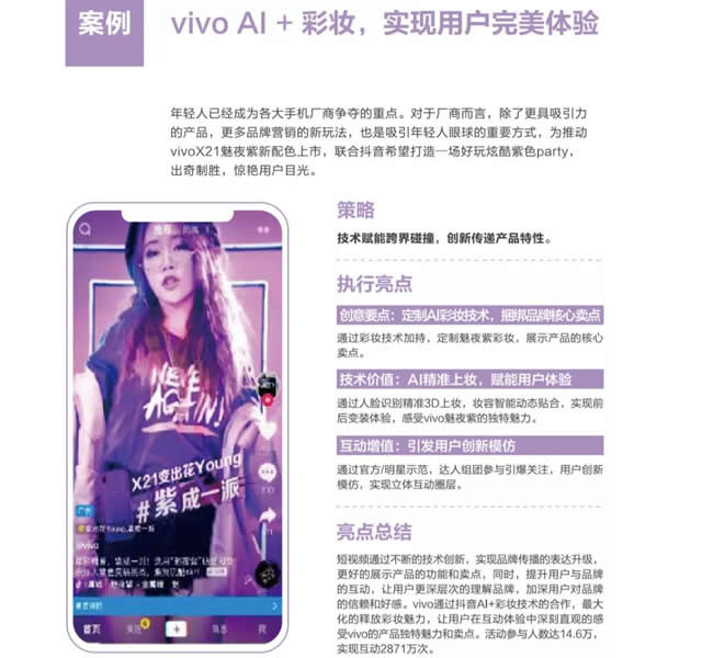 3.借力AI内容经营力,制造品牌超感体验。 短视频平台通过自身技术优势,不断开发适用于营销的技术产品,激发更多创意表达的内容互动方式,比如创意定制贴纸、BGM创作互动等新技术和新体验,为用户提供更为丰富的互动形式,也为品牌合作提供更多创新营销想象力。