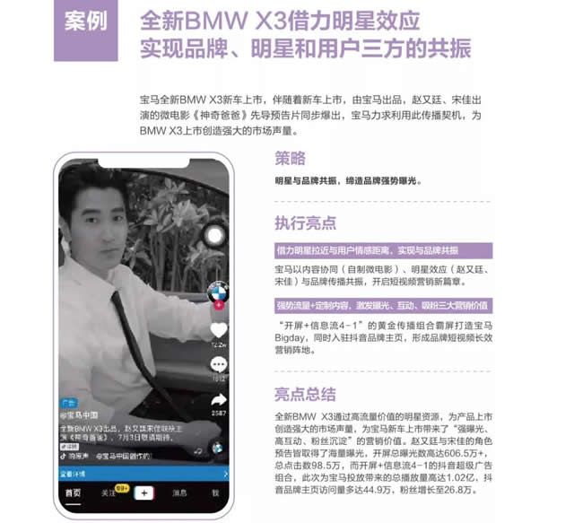 4.明星达人引领分享,激发全民参与内容共创,实现品牌声量裂变。 数据显示,超过42.5%的数字营销决策者在短视频营销中选择达人、明星视频定制作为营销的内容,超过70%的用户因为受明星达人的影响推荐而产生消费行为,在抖音上,明星达人能帮助品牌大大提升内容曝光度,加速完成前期冷启动。