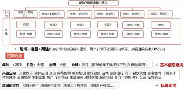 B客户:日消费500-5000元 地域+楼盘+用途作为计划搭建的基本逻辑,每个计划下设置定向单元,如普通定向和LBS定向