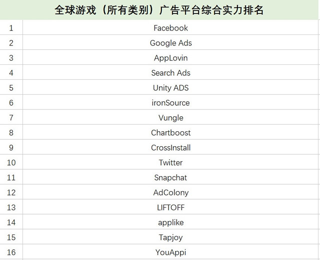 AppsFlyer 2018 上半年《广告平台综合表现报告》调查样本 1、游戏渠道总量减少,头部平台优势地位牢固 对比此前的游戏类型的广告平台榜单,我们发现,此次榜单中游戏广告平台的数量大约减少了 20%。与此相对的是,游戏广告主更积极地同时使用更多的媒体渠道,也更清楚应在哪些渠道投入其预算。 在游戏类别中,广告平台之间的排名差异更小,Facebook、Google、AppLovin 和苹果搜索广告在三种游戏类型的全球排名中均占据前四位。