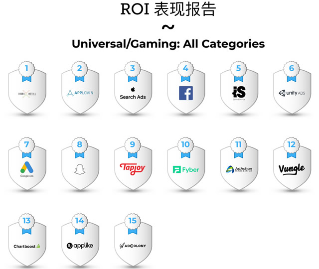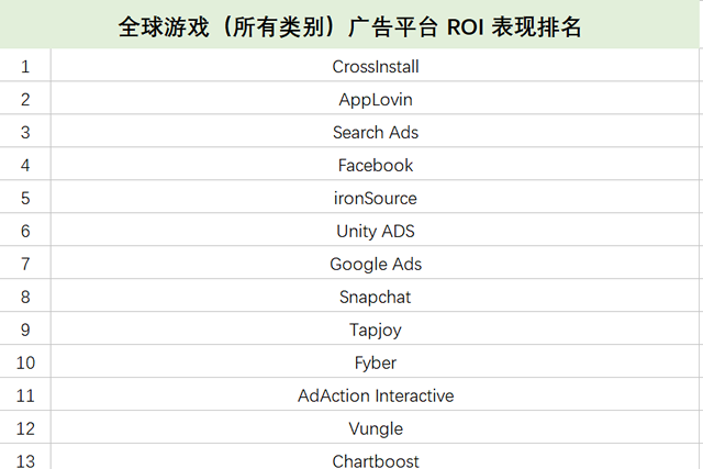 全球游戏(所有类别)广告平台综合实力排名 当然,对于游戏营销人员来说,广告平台的综合实力固然重要,但在实际投放过程中,ROI 才是大家最为关注的指标。数据显示,全球面向游戏的广告平台的中,ROI 的排名与上述实力排名有所不同。可以看到,CrossInstall 在 ROI 榜单中排名第一,前半年霸榜的《Loveballs》、《Happy Glass》等爆款休闲游戏幕后推手 AppLovin 排名第二,苹果应用商店搜索广告排名第三。